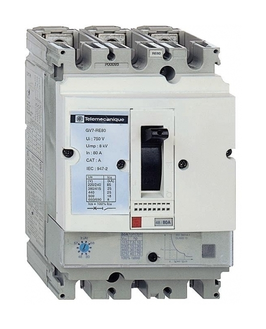GV7RE80 Автоматический выключатель с комбинированным расцеплением48-80А 36ka. диапазон: TeSys - наименование изделия: TeSys GV7 - тип устройства или его аксессуаров: автоматический выключатель - область применения: двигатель - тип сети: переменный ток - отключающая способность: 85 кА Icu в 220/240 V переменный ток 50/60 Гц в соответствии с IEC 60947-2, 25 кА Icu в 500 V переменный ток 50/60 Гц в соответствии с IEC 60947-2, 35 кА Icu в 440 V переменный ток 50/60 Гц в соответствии с IEC 60947-2, 36 кА Icu в 380/415 V переменный ток 50/60 Гц в соответствии с IEC 60947-2, 8 кА Icu в 660/690 V переменный ток 50/60 Гц в соответствии с IEC 60947-2 - [Icu] номинальная предельная наибольшая отключающая способность (на к.з.): 100 % в 220/240 V переменный ток 50/60 Гц в соответствии с IEC 60947-2, 100 % в 440 V переменный ток 50/60 Гц в соответствии с IEC 60947-2, 50 % в 660/690 V переменный ток 50/60 Гц в соответствии с IEC 60947-2, 100 % в 380/415 V переменный ток 50/60 Гц в соответствии с IEC 60947-2, 50 % в 500 V переменный ток 50/60 Гц в соответствии с IEC 60947-2.