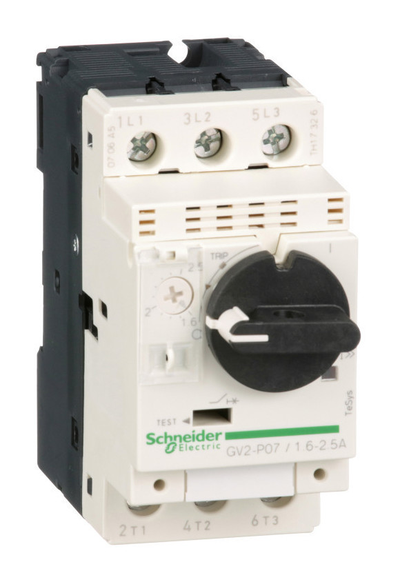GV2P07 – автоматический выключатель TeSys GV от Schneider Electric, предназначен для защиты электродвигателей 0.75kW@400V. Обеспечивает защиту от перегрузки по току и от коротких замыканий, диапазон уставок теплового расцепителя (от перегрузки) 1.6-2.5A, электромагнитный расцепитель с фиксированной уставкой 12xIn, высокая отключающая способность Icu 100kA@400V. Поворотная рукоятка гарантировано рассчитана на 100 000 циклов в условиях AC-3 415V. Доступность по всему миру, сертифицирован по множеству стандартов (IEC, UL, CSA, CCC, EAC, Marine) и подходит под условия Green Premium (RoHs/Reach).